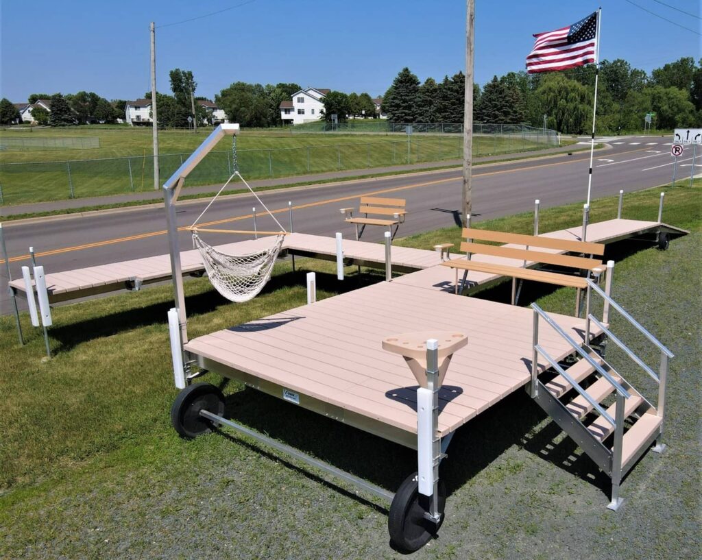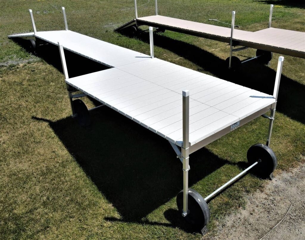 DISPLAY MODEL V-DOCK SYSTEMS: These display docks were made in May of 2023. The units were used as display models in our yard for the summer. They have been walked on, rolled around, and rained on, but never placed into the water. Only one of each, so quantities are limited. We need them out of our yard before the snow flies. We can not change the color of the decking, but we can make them longer or change the direction of the sundeck. The legs you receive will be changed out for the correct size leg for your water depth in your lake. They will be loaded up on one of our trailers FREE for you to used. Simply return the trailer when you are finished. All you need is a 2” ball hitch. We cannot ship them out-of-state due to them being already assembled.