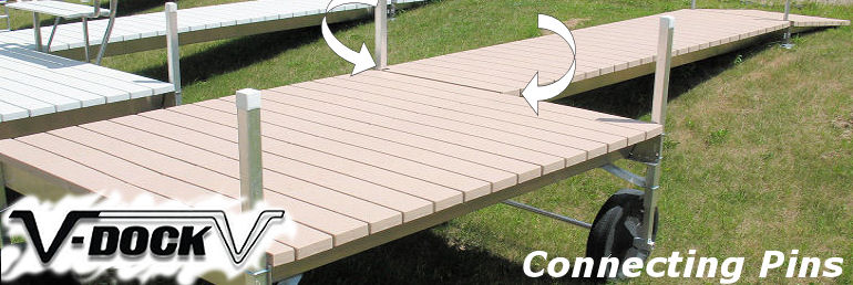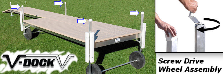 V Docks are easy to install – even if you’ve never put a dock in before! The user-friendly screw drive wheel assembly is part of both the roll-in and roll-out docks. With five different sizes, there’s a leg for any water depth and independent legs to accommodate uneven ground. These ergonomically sound posts adjust easily with a removable hand crank – or you can also use a cordless drill to adjust your dock height. No dangerous winches to use! You can make all your adjustments from the top of the dock, with easy to operate connecting pins and hanger brackets. The maintenance-free parts never need greasing and are standard with all V-Dock roll-in docks.